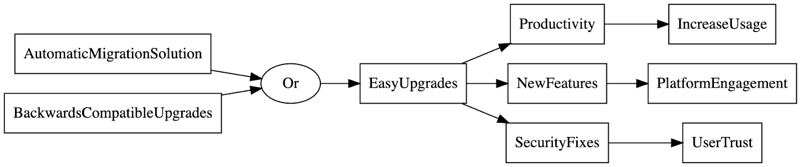 Once we’ve done the and-node expansions, we can consider or-nodes. For each of the goals we’re examining, what are the alternative ways to achieve them? For the goal “Enable users to upgrade to newer versions of packages quickly and easily,” there’s a clear alternative, which is to ensure new package versions are backwards compatible with old ones. Then, updates require no updates to client code. We visualize this as an or-node under EasyUpgrades: