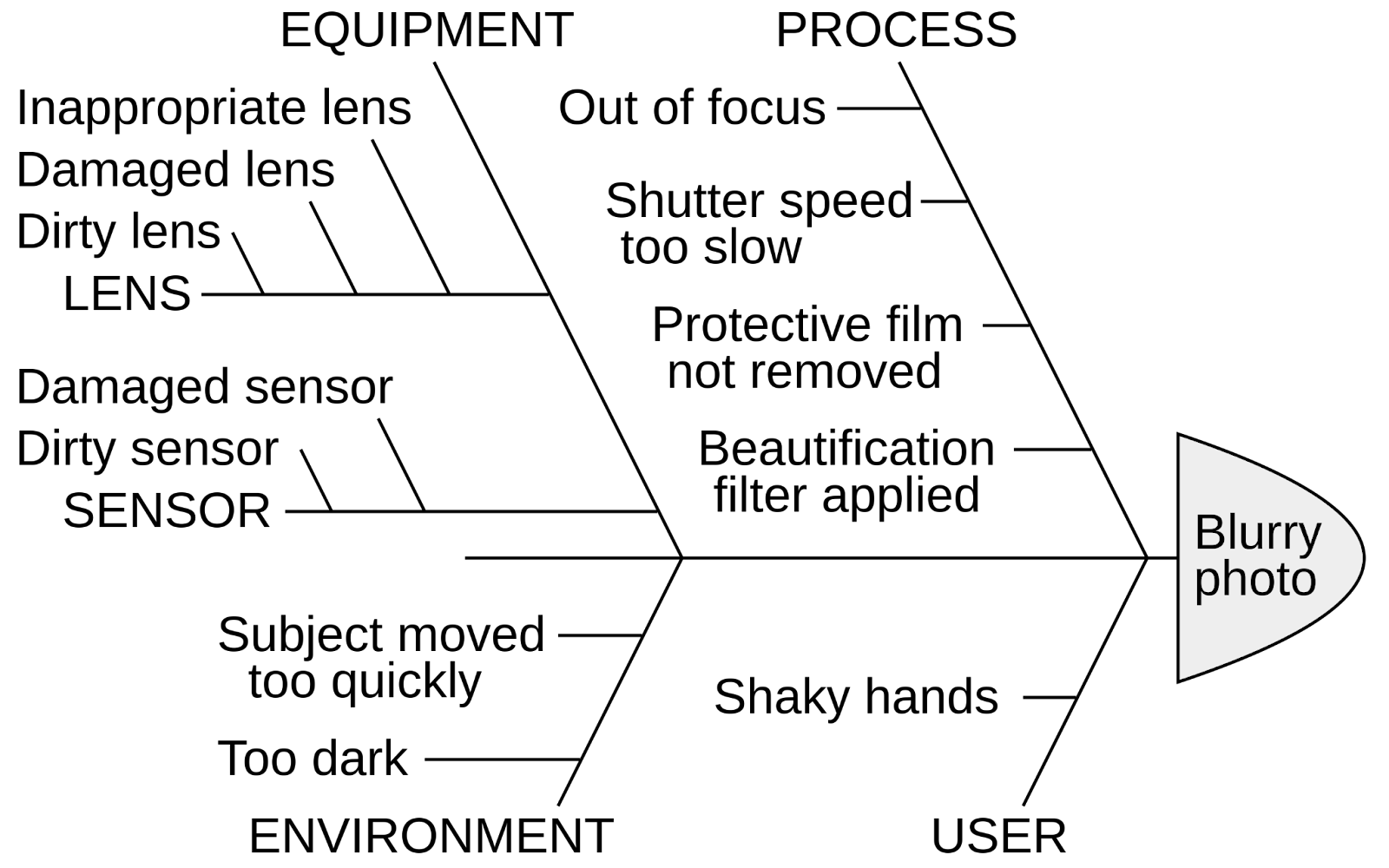 In researching this article, I learned that in 1962, 37 years before Schneier published his article on Attack Trees, Bell Laboratories had developed a similar technique called Fault tree analysis. Ishikawa diagrams (pictured below) were also popularized in the 1960s. These techniques fall under the general category of Root cause analysis, which includes popular quality control techniques like the Five whys.