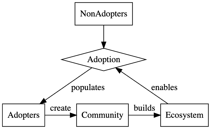 We can visualize Adoption as a flow between two stocks, NonAdopters and Adopters, with the Ecosystem enabling that flow: