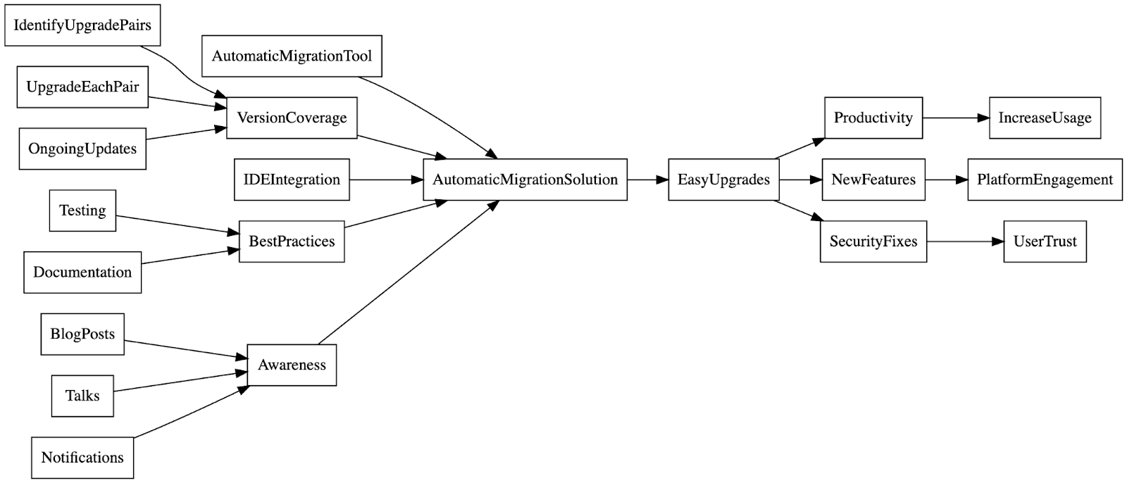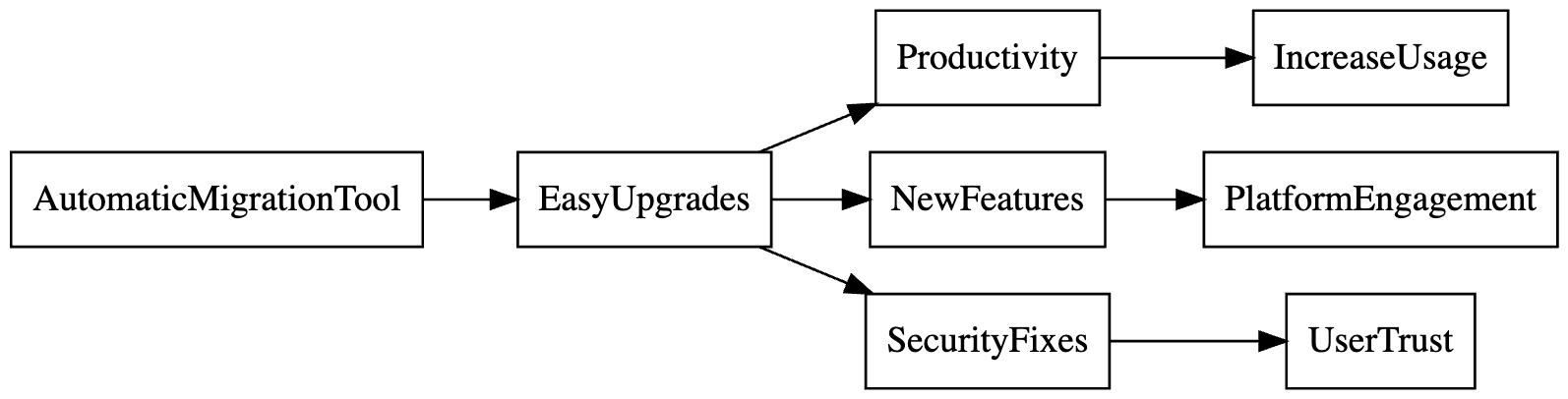 Visualizing these relationships, we connect our AutomaticMigrationTool idea up to the EasyUpgrades goal and to each organizational goal that this serves.