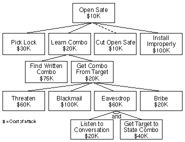 In this attack tree, the attacker’s goal is “Open Safe”, and each child “Pick Lock”, “Learn Combo”, etc. is an alternative way to achieve that goal. “Eavesdrop” is the only and-node in the tree, with “Listen to Conversation” and “Get Target to State Combo” as the required subgoals. Schneier has annotated this attack tree with the cost of achieving each goal: the cost of an and-node is the sum of its children’s costs; the cost of an or-node is the cheapest of its children. “Cut Open Safe” is the cheapest way for the attacker to achieve the top-level goal. A defender can use this analysis to make attacks more costly, for example, by expanding “Cut Open Safe” into an and-node that also requires “Gain Access to Safe” and making that more difficult with additional physical security.